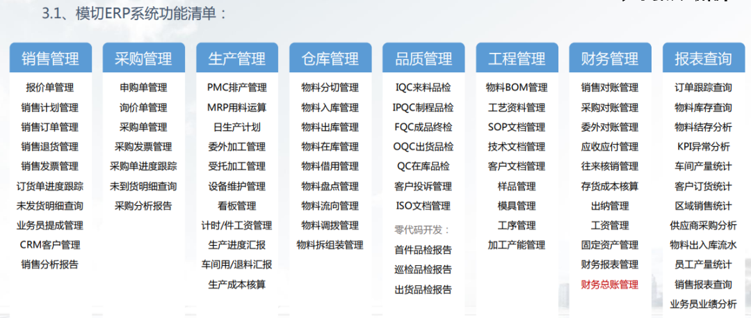 面对当前制造企业数字化、智能化转型迫切需求,ERP系统是实现模切企业精细化管理的重要途径,能够帮助模切企业实现透明化生产管理,受到越来越多模切企业的认可和重视。点晴模切ERP系统是一款专为模切行业提供可视化生产管理系统,强调对模切企业内部甚至外部的资源进行优化配置,从销售、采购、 生产(MRP/排产/制程管控)、仓库(原辅料/成品/ 刀模)、工程( BOM/工艺/样品)、品质、财务 (对账/存货核算/总账)等多维度进行精细化管理,全面提高模切企业管理能力,以管理的方式达到降本增效的目的。