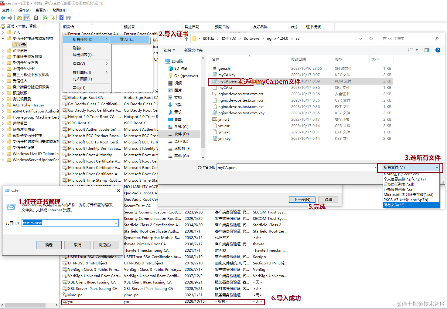 导入 myCA.pem 证书到受信任的根证书颁发机构(Win+R 打开:certlm.msc
