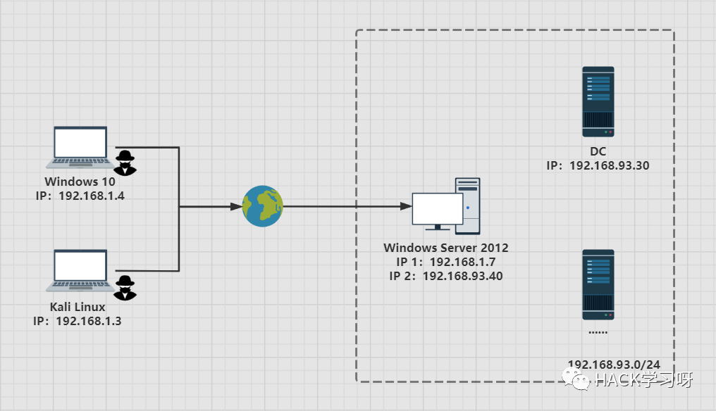 大致原理是,当 SocksOverRDP-Plugin.dll 在 RDP 客户端上被正确注册后,每次启动远程桌面时都会由 mstsc 加载。接着,当 SocksOverRDP-Server.exe 被上传到 RDP 服务端上传并执行后 ,SocksOverRDP-Server.exe 会在动态虚拟通道上回连 SocksOverRDP-Plugin.dll,这是远程桌面协议的一个功能。虚拟通道设置完成后,SOCKS 代理将在 RDP 客户端计算机上启动,默认为 127.0.0.1:1080。此服务可用作任何浏览器或工具的 SOCKS5 代理。并且服务器上的程序不需要服务器端的任何特殊特权,还允许低特权用户打开虚拟通道并通过连接进行代理。 通过 SocksOverRDP 搭建 SOCKS5 代理测试环境如下: ![]() 右侧为一个内网环境,其中 Windows Server 2012 是一个 Web 服务器,有两个网卡,分别连通内外网。假设此时攻击者已经通过渗透手段拿下了这台 Web 服务器,需要设置代理进入内网继续对内网进行横向渗透。但是由于防火墙的规则等原因,只允许 TCP/UDP 3389 端口可以进行通信,所以我们只能尝试利用用 RDP 协议来建立通讯隧道。 攻击端在攻击机上需要安装注册 SocksOverRDP-Plugin.dll。首先我们将 SocksOverRDP-Plugin.dll 放置到攻击机的任何目录中,但是为了方便我们可以将其放置到 然后使用以下命令对 SocksOverRDP-Plugin.dll 进行安装注册: