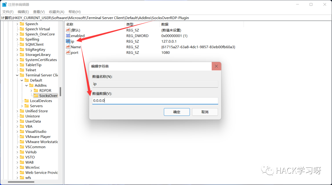 ![]() 如上图所示,注册成功。但是由于 SocksOverRDP 建立的 SOCKS5 代理是默认监听在 127.0.0.1:1080 上的,所以只能从攻击机本地使用,为了让攻击者的 Kali 也能使用搭建在攻击机 Windows 10 上的 SOCKS5 代理,我们需要修改其注册表,将 IP 从 127.0.0.1 改为 0.0.0.0。注册表的位置为: