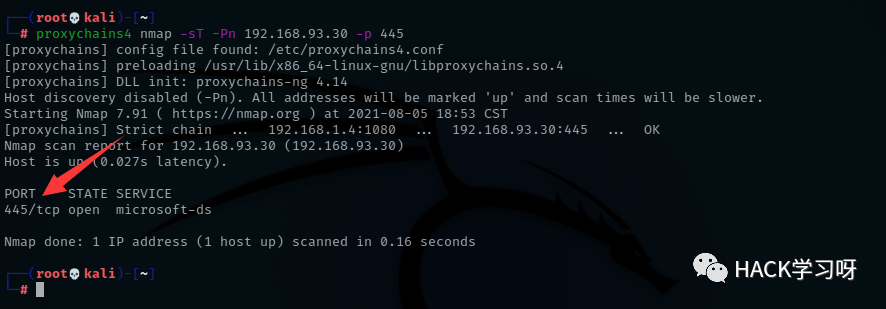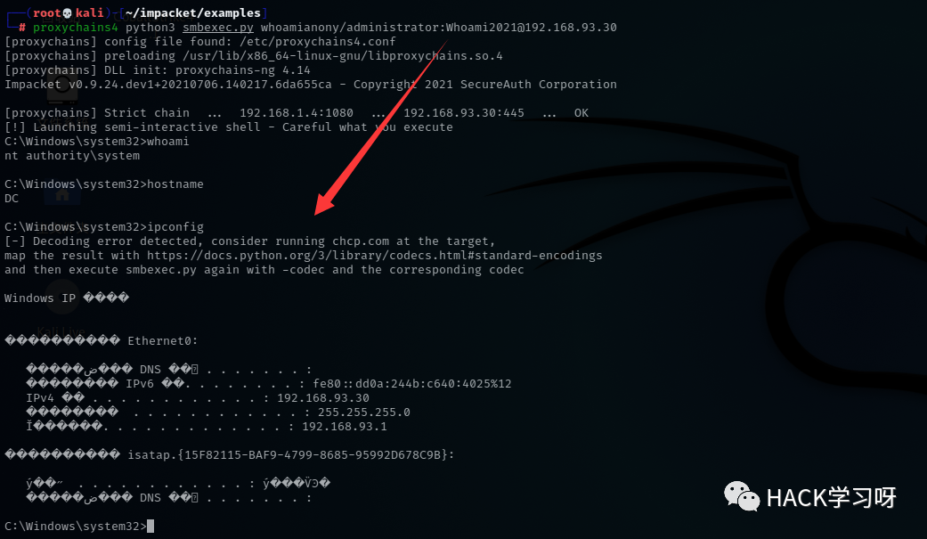 ![]() 先该主机开启了 445 端口,我们可以直接用 smbexec.py 连接: