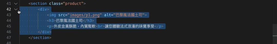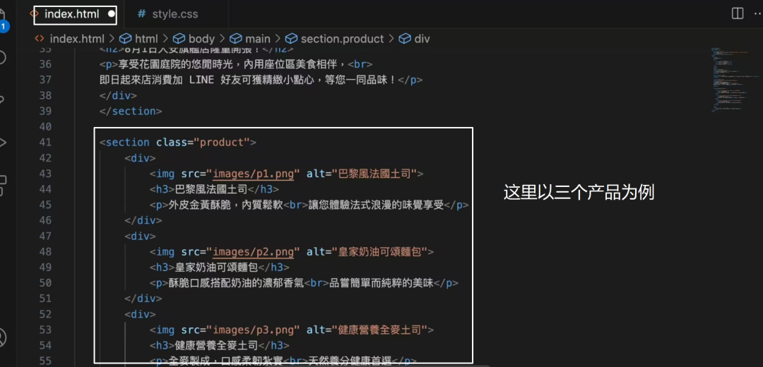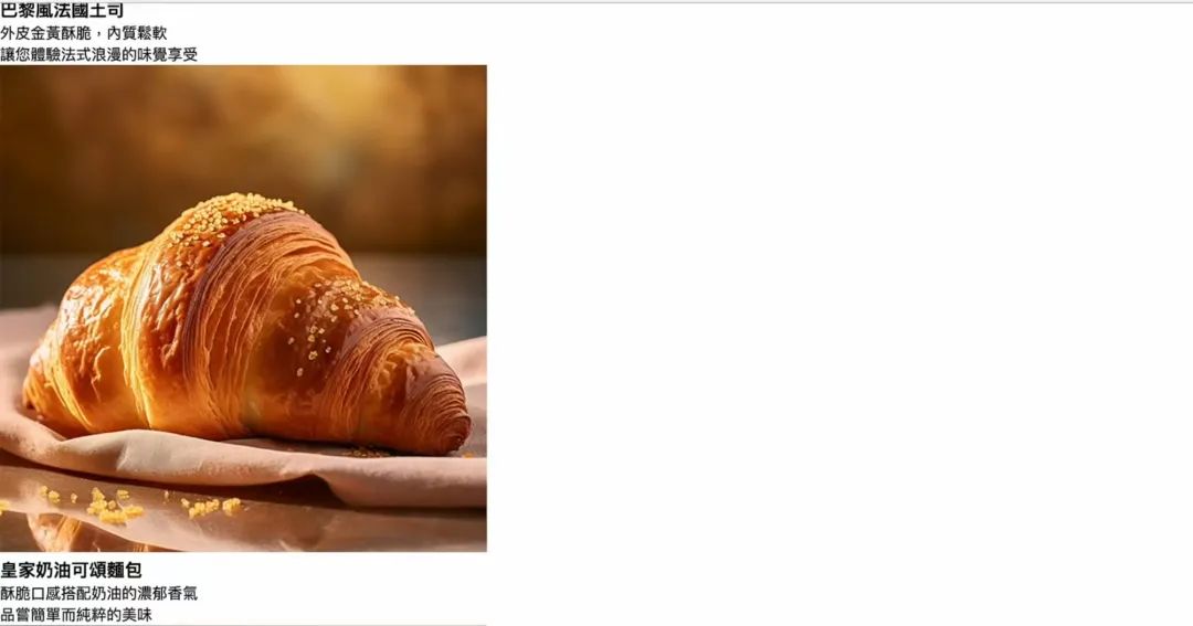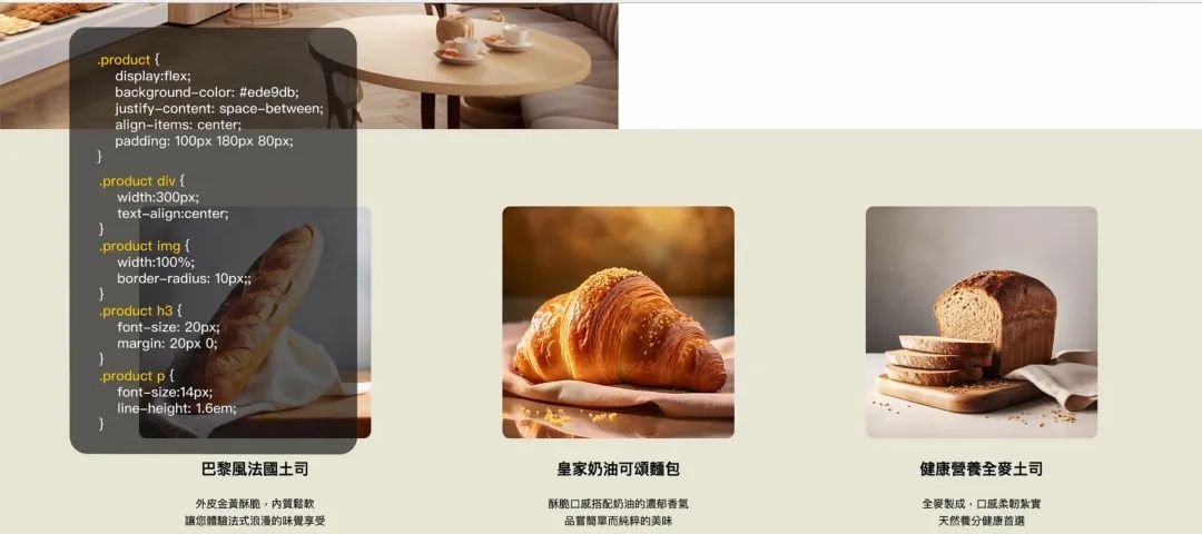 ◦ 移动端:卡片自动纵向排列 ◦ 桌面端:卡片横向平铺 2. 无障碍优化 ◦ 图片均有描述性 alt 属性(如 alt="巴黎風法國土司") ◦ 标题层级 (<h3>) 帮助屏幕阅读器导航 3. 内容与样式分离 通过 class="product" 实现:(CSS代码)