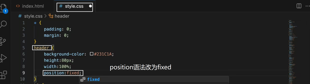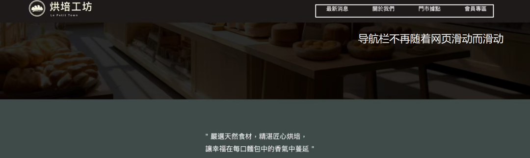 如上所示,只需要回到CSS样式表内,将<header>页首的position语法改为"fixed",导航栏就会固定在顶部,不再随着网页的滑动而滑动。