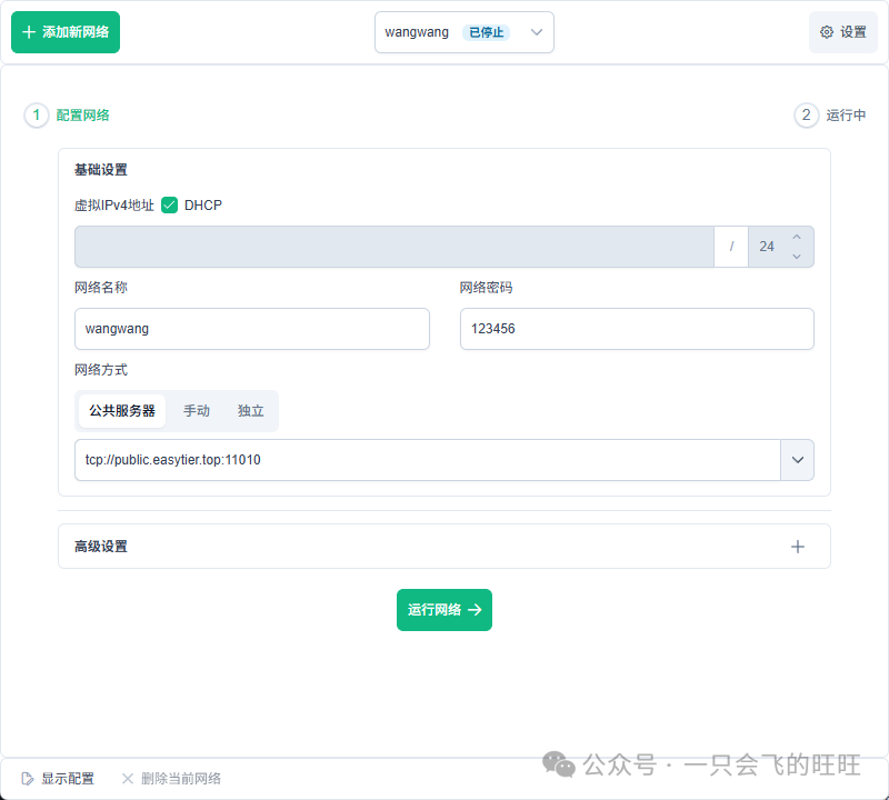 我们只需要配置一个网络名称和密码,保持默认的公共服务器配置,点击运行网络,就完成操作了!
