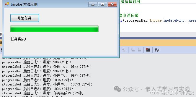 // 调用Invoke,传递进度参数并接收返回值         // 定义带参数和返回值的委托(输入进度值,返回状态字符串)         Func<intstring> updateFunc = (i) =>         {             // UI操作:更新进度条             progressBar.Value = i;             // 生成状态描述             string status = $"进度:{i}%({DateTime.Now:ss}秒)";             return status; // 返回状态给后台线程         };         // 调用Invoke,传递进度参数并接收返回值         string currentStatus2 = (string)progressBar.Invoke(updateFunc, progress);         // 后台线程使用UI返回的结果(如日志输出)         Console.WriteLine($"progressBar 后台日志2:{currentStatus2}");         return;     }     progressBar.Value = progress; } private void statusLabel_log(string message) {     if (statusLabel.InvokeRequired)     {         //调用Invoke,传递参数         //statusLabel.Invoke(new Action<string>(statusLabel_log), message);         // 调用Invoke,传递进度参数并接收返回值         // 定义带参数和返回值的委托(输入进度值,返回状态字符串)         Func<stringstring> updateFunc = (info) =>         {             // UI操作:更新进度条             statusLabel.Text = info;             // 生成状态描述             string status = $"进度:{info}%({DateTime.Now:ss}秒)";             return status; // 返回状态给后台线程         };         // 调用Invoke,传递进度参数并接收返回值         string currentStatus2 = (string)progressBar.Invoke(updateFunc, message);         // 后台线程使用UI返回的结果(如日志输出)         Console.WriteLine($"statusLabel 后台日志2:{currentStatus2}");         return;     }     statusLabel.Text = message; }