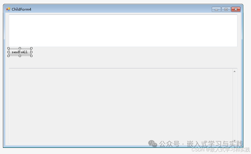 using System;using System.Collections.Generic;using System.ComponentModel;using System.Data;using System.Drawing;using System.Linq;using System.Text;using System.Threading.Tasks;using System.Windows.Forms;namespace MultiWindowCommunication.Forms{ public partial class ChildForm2 : Form { public event EventHandler<string> SendMessageToMain; public ChildForm2() { InitializeComponent(); } public void ReceiveMessage(string message) { txtReceived.Text = $"收到主窗口消息: {message}"; } private void btnSendToMain_Click(object sender, EventArgs e) { if (!string.IsNullOrEmpty(txtMessage.Text)) { SendMessageToMain?.Invoke(this, txtMessage.Text); txtMessage.Clear(); } } }}
