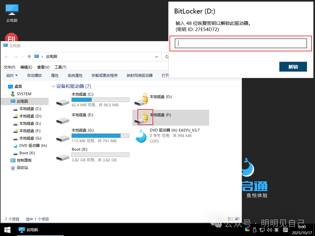 📌 需求 2:想读 C 盘数据,或通过 PE 系统救数据如果电脑开不了机,想用 PE 盘(U 盘启动盘)读 C 盘数据,会发现 “磁盘显示加密,读不了”—— 这是 BitLocker 的保护机制,必须先解锁: