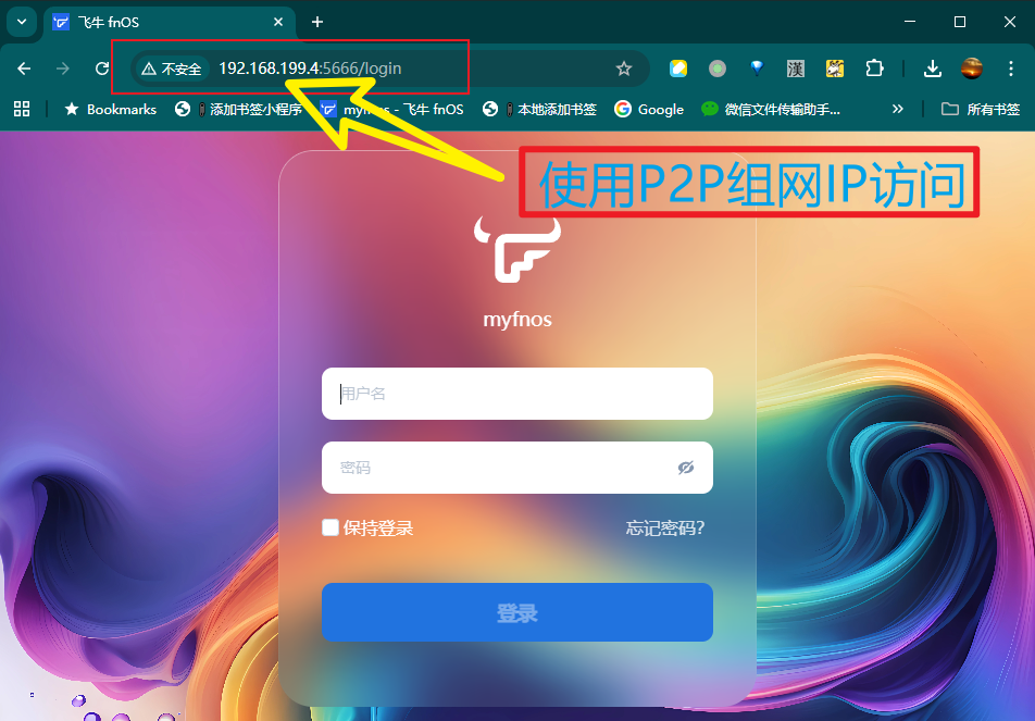 组网成功后,局域网中的IP(192.168.199.0/24)是可以互访的。比如在第二个成员上 ping 原始节点:可以 ping 通,代表 P2P 网络建立,后续就可以通过组网的局域网IP进行内网通讯了。使用 easytier 将家里的设备比如飞牛NAS和办公室的电脑组成一个P2P网络,方便在家办公或远程控制家里的设备。与 frp 相比,frp 是端口级的代理,easytier 把整个网段都搞通了,支持 ping 以及直接IP访问不需要定义端口转发。组网成功后可以通过 easytier-cli 工具查看局域网内的节点信息:以飞牛NAS为例,组网成功后就可以通过组网IP进行访问了:因为 easytier 是去中心化的,没有服务器和客户端的区分。只要一个设备能与虚拟网络中的任意节点通信,它就可以加入虚拟网络。如果你没有云主机作为中间节点,可以使用公共的共享节点,组网成功后就不需要中间节点了,并且网速取决于P2P节点。当前实验只是组网成功,实际测试发现网络效率不太高,通过飞牛看视频有点卡。有可能是配置错误没有启用P2P功能。因为使用的是自建云节点,没有使用公共共享节点,所以没开认证。在实际使用中要配合防火墙和必要的认证措施,避免暴露在互联网上。