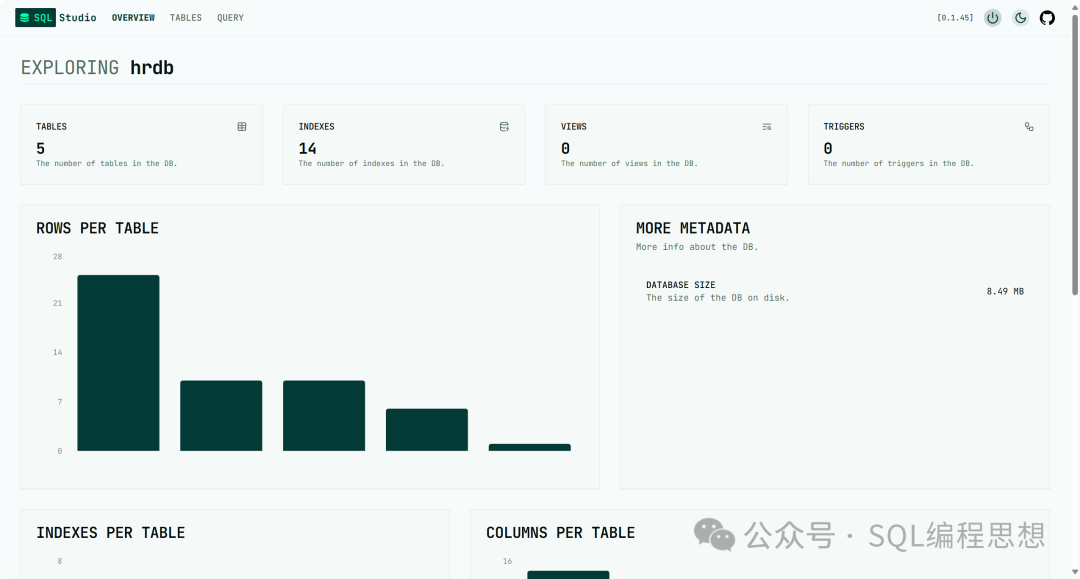 • • 数据库概览:Overview 页面提供了关于数据库的汇总信息,包括表、索引、视图、触发器的数量、表中的行数汇总、数据库大小等。