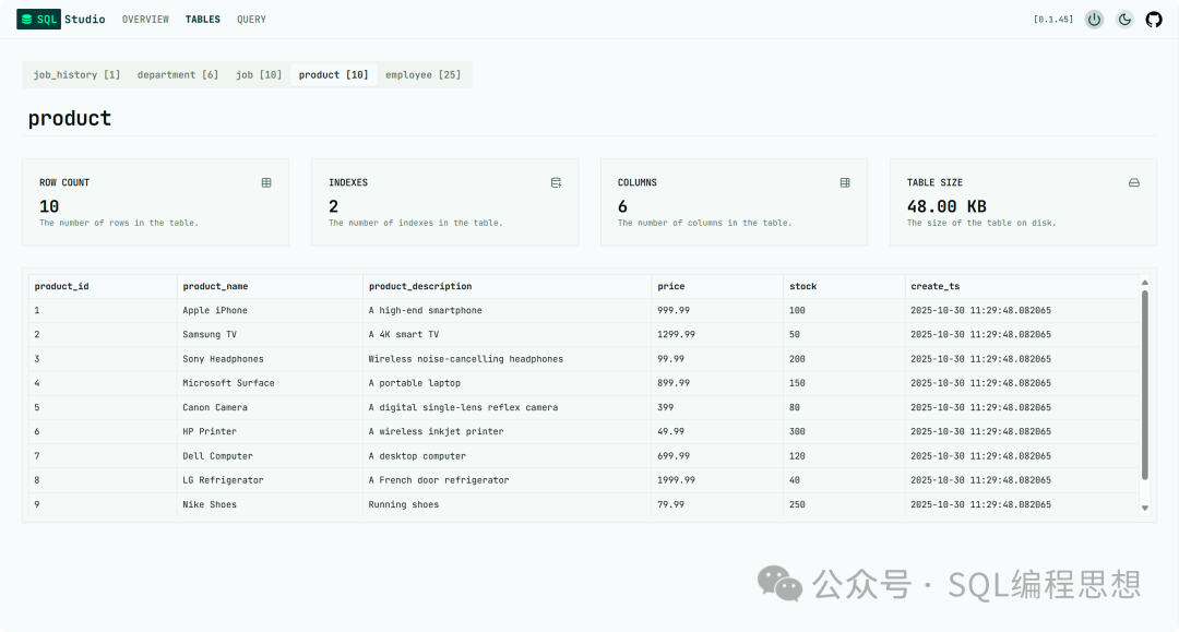 • • 轻量级:SQL Studio 编译成了单个二进制文件,大小只有几十 MB,启动服务只需要一个命令。