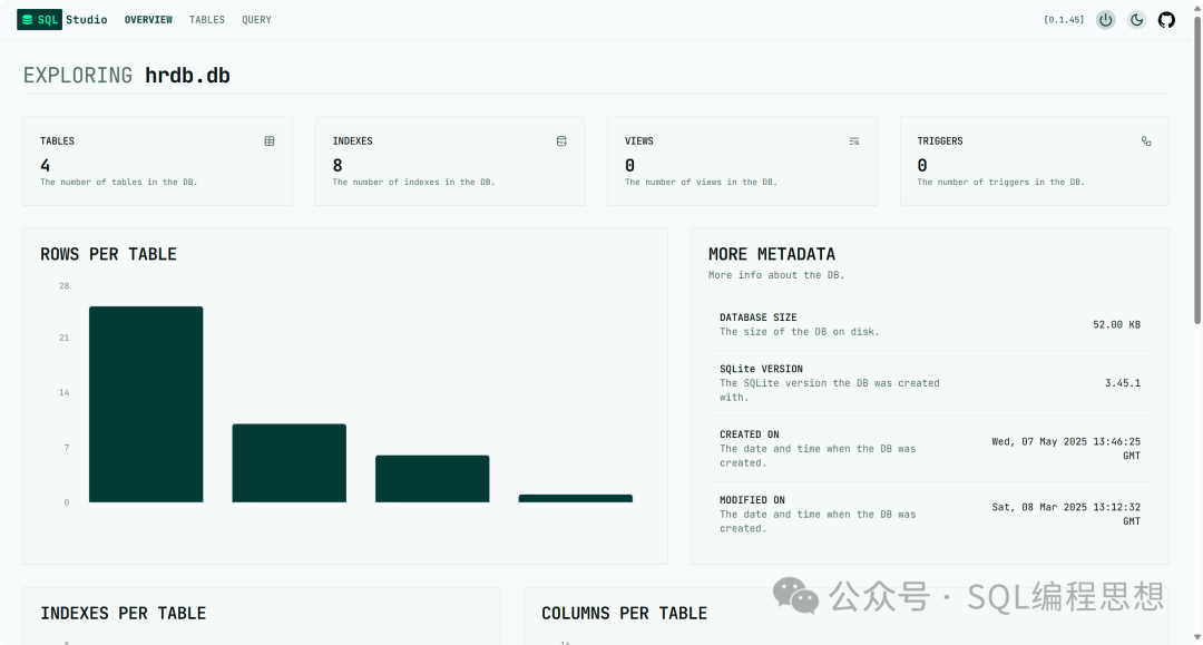 • • 表结构概览:TABLES 页面显示了每个表的具体信息,包括字段数量、索引数量、总行数以及表的大小。