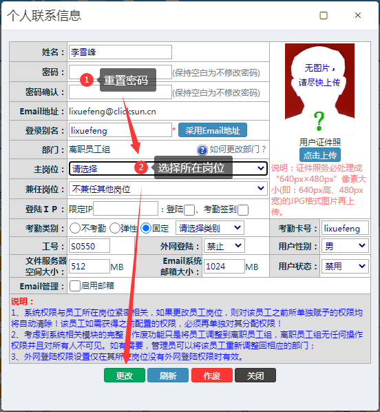 所在部门”务必选择为“全部+含离职员工”或者“离职员工组”,系统提示重复的用户名录入到“英文名”,就可以查出已经存在的用户了,正常情况下该用户应该已经被调整至“离职员工组”了。找到此用户,点击“姓名(用户管理)”中对应的用户名,然后在以下弹出页面中,重新设置登录密码,并设置主岗位为此员工应去的新岗位,就可以调整该员工到正常部门再次使用了。